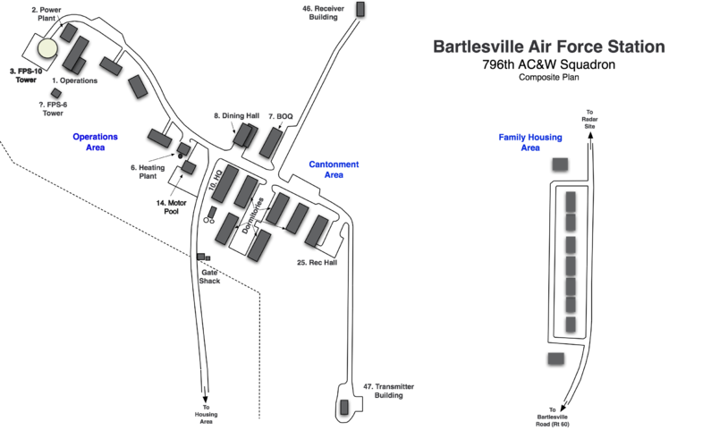 The physical plant of the site was divided into the main site, a cantonment area, a housing area, and two radio sites. The main site housed the operations buildings, the radar towers, and the backup generators. The cantonment area housed the enlisted barracks, the bachelor officer's quarters, the orderly room, the dining hall, the motor pool, and other support buildings. South from the main site was a small 9 unit housing area for married personnel.