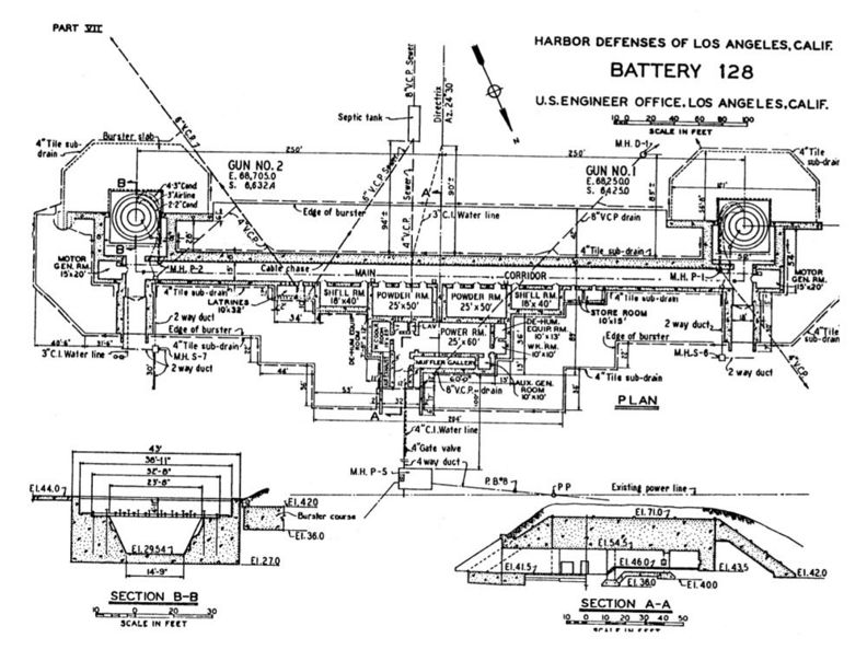 HistoryPart of the Harbor Defenses of Los Angeles. Battery 128 was to be a battery of two, 16" Long Range naval guns with each gun position in a reinforced concrete casemate. The casemates were at either end of an earth covered reinforced concrete support structure. Construction began 17 Apr 1943 and was curtailed 26 Nov 1943. The Battery declared complete 21 Jan 1944 even though it lacked some equipment and the guns. It was turned over for service 5 Jan 1945 in its curtailed condition at a cost of $758,879. The guns were never delivered and the Battery was abandoned in 1948 when the Bolsa Chica Military Reservation closed. An underground Plotting-Switchboard-Radio (PSR) structure for Battery 128 was built behind the battery.