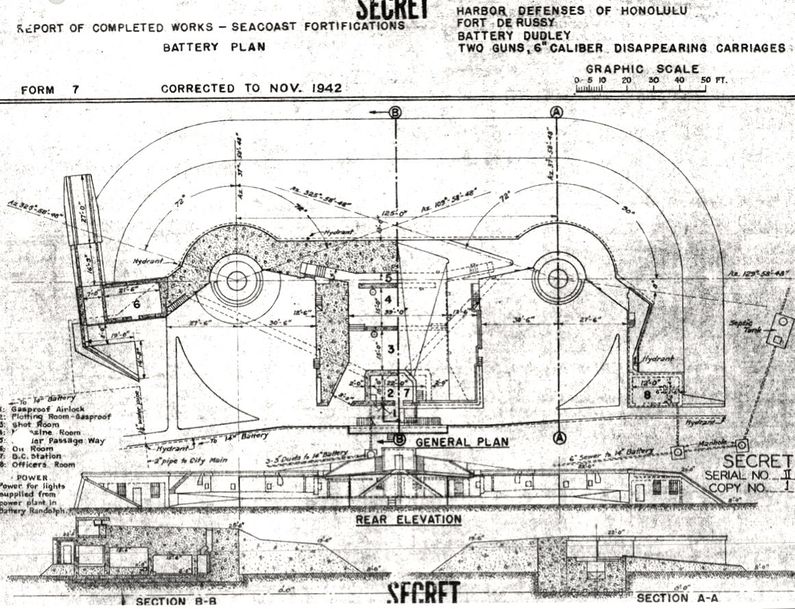 Battery Dudley (1913-1946) - Battery Dudley was a reinforced concrete, Taft Period 6 inch coastal gun battery on Fort De Russy, Honolulu County, Hawaii. The battery was named in G.O. 59, 1911, after Brigadier General Edgar S. Dudley (Cullum 2326). Battery construction started in July 1909, was completed in July 1913 and transferred to the Coast Artillery for use 5 Aug 1913 at a cost of $ 76,160. Upgraded in 1937. Deactivated in 1946. Taft Period (1890-1910)Part of the Harbor Defense of Honolulu. Originally built as a Taft Period concrete coastal gun battery with two 6" M1908 guns mounted on M1905M1 Disappearing carriages. This was a single story battery with the guns located on the same level as the magazines. Shells were moved from the magazines to the gun loading platform by shell carts. No shell or powder hoists were needed or provided. Electrical power was furnished by the emplacement power plant in Battery Randolph and by commercial power.