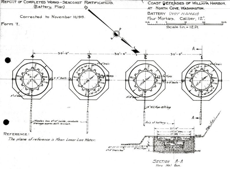 Battery Willapa-2 (1919-NA) - Battery Willapa-2 was a reinforced concrete, World War I 12 inch coastal mortar battery on Willapa Military Reservation, Washington. The battery was unnamed. Battery construction started Jun 1918, was completed Oct 1918, and transferred to the Coast Artillery for use on 6 Oct 1919 at a cost of $ 15,235.84. Deactivated in 1919. World War I (1917-1918)Part of the Harbor Defense of Willapa Harbor. Originally built as a World War I concrete coastal mortar battery for, four 12" Mortars mounted on 12" mortar carriages, never armed. This battery was four separate concrete emplacements for 12" mortar carriages and mortars.