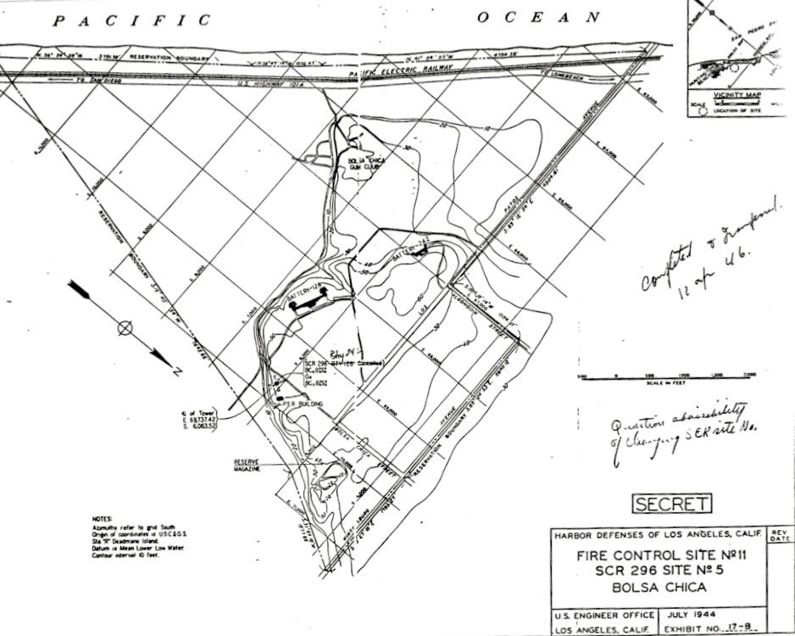 Bolsa Chica Military Reservation (1942-1948) - A World War II Coastal military reservation first established in 1942 through fee, leaseholds and permits. Located at present day Huntington Beach, Orange County, California. A sub-post of Fort MacArthur. Deactivated in 1948. World War IIPart of the Harbor Defense of Los Angeles. This reservation was established early in 1942 on the property that the Bolsa Chica Gun Club occupied. The lower lagoon level was chosen to house the first temporary mobile battery and the gun club's clubhouse became a temporary barracks. Leases and permits were obtained for use of the full reservation by May 1942. Construction began for the temporary battery and for two modern larger caliber gun batteries even before all the property was formally acquired. The two new modern batteries were located on a higher mesa overlooking the lagoon in the middle of the reservation. The reservation was initially armed with two tractor-drawn 155mm GPF Guns in field emplacements right after the U.S. entry into World War II. The initial field emplacements were replaced with two reinforced concrete Panama mounts for the 155mm guns that were completed in February 1942, see Battery 155 - Bolsa Chica. While this battery was completed in February 1942, it was not formally accepted for service until 15 Nov 1943. Construction on the two modern gun batteries began later in 1943. One 6" gun Battery 242 and one 16" gun Battery 128 were planned for the military reservation. Battery 128 was substantially completed but never armed when it was deemed to be unnecessary in November 1943. Battery 242 was armed and became operational before the war's end. The reservation was deactivated after the end of the war in 1948. Additional structures on the reservation included an underground Plotting-Switchboard-Radio (PSR) structure for Battery 128, a reserve ammunition magazine, a fire control tower and a SCR-296A Radar installation.