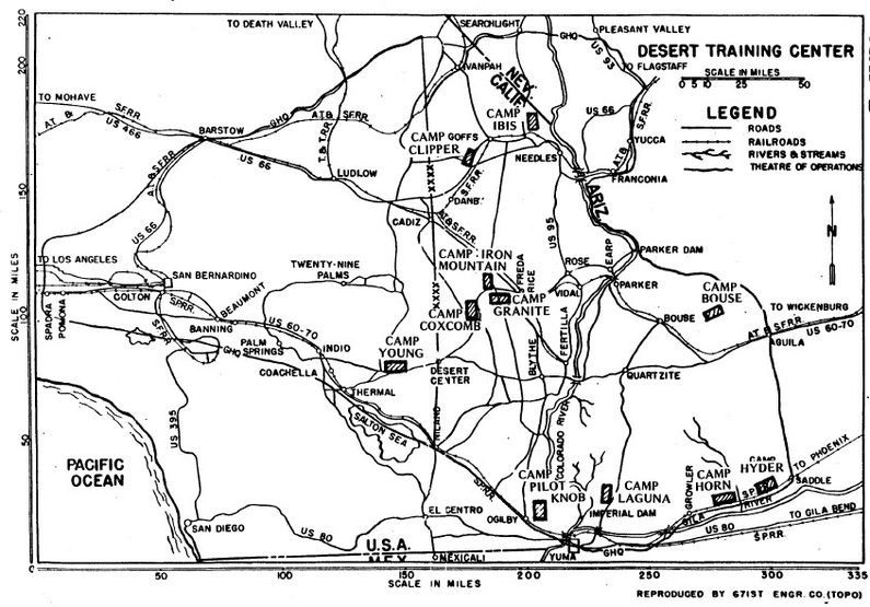 California-Arizona Maneuver Area (1942-1944) - A World War II training area established in 1942 as the Desert Training Center (DTC) in California and Arizona. Renamed the California-Arizona Maneuver Area (CAMA) later in 1942. Closed on 30 Apr 1944. HistoryEstablished by Major General George S. Patton Jr (Cullum 4795) shortly after the start of World War II and officially opened on 30 Apr 1942 to train U.S. troops in desert warfare. The Desert Training Center came to include eleven divisional camps, a headquarters camp, two support camps, nine camp airfields, and three major support airfields. The training area was initially known as the Desert Training Center but was renamed on 20 Oct 1943 as the California-Arizona Maneuver Area. Camp Young (1) was the first camp established and it became the headquarters camp, officially named on 12 May 1942. General Patton was ordered to find a suitable large-scale site in southeastern California and western Arizona. General Patton and his staff arrived at March Airfield, Riverside, California on 4 Mar 1942 and spent three days evaluating areas in California, Nevada, and Arizona. He settled on an area roughly bounded by Palm Springs CA on the west, Yuma AZ on the south, Prescott AZ on the east, and Searchlight NV on the north. General Patton became the first commander of the Desert Training Center but remained there only until 2 Aug 1942 when he was called to other duties.