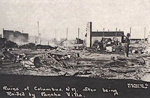 HistoryEstablished in 1912 as a U.S. Army border camp amid rising tensions along the United States-Mexican border during the Mexican Revolution. The town of Columbus and the camp were attacked on 9 Mar 1916 by Pancho Villa and about 500 of his men. Villa burned down much of the town but determined resistance from the U.S. soldiers from the camp killed sixty to eighty of the attackers and they retreated back over the border. A machine gun platoon from the 13th U.S. Cavalry under 2nd Lt. John P. Lucas (Cullum 4990) set up its guns under fire in the town square and was credited with inflicting many casualties among the attackers and then driving the rest away. The raid on Columbus and other towns along the border prompted President Woodrow Wilson to send General John J. Pershing on a punitive campaign into Mexico to capture Pancho Villa and end the raids. The expedition was partially successful but did not capture Villa. President Wilson recalled Pershing back to the United States early in 1917 after an embarrassing defeat at the Battle of Carrizal and because it was clear that the U.S. would have to enter World War I. Camp Furlong was the site of the first tactical military airfield in the U.S. with the 1st Aero Squadron and Curtiss JN3 Jenny biplanes providing observation and scouting. The post also had supply and repair facilities for the early military trucks used in Mexico. The camp housed more than 5,000 troops at one point. It was discontinued in 1918 but used intermittently until 1924. Current StatusCamp Furlong Historic Site and Pancho Via State Park, Columbus, Luna County, New Mexico.