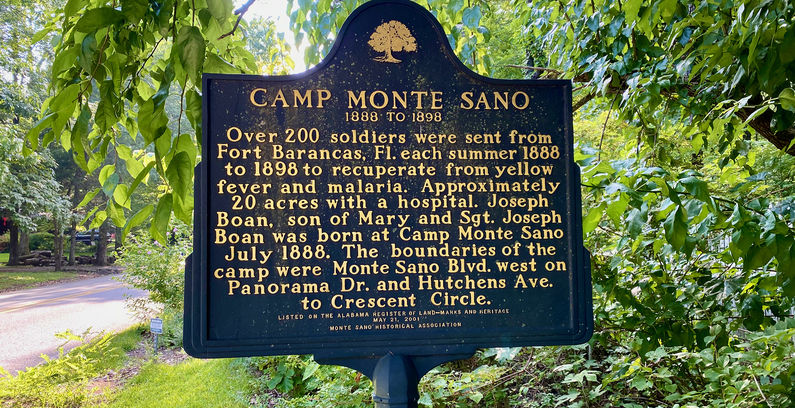 HistoryEstablished in 1888 as a rest and recovery camp from yellow fever and malaria by personnel from Fort Barrancas near Pensacola, Florida. The camp was on a high plateau overlooking the city of Huntsville, Alabama. . The Camp was described as having some 20 acres with a hospital. The boundaries of the camp were Monte Sano Boulevard west on Panorama Drive and Hutchens Avenue to Crescent Circle at Monte Sano. With clean air and abundant spring water, the camp was billed as a rest and recovery camp as well as a refuge from yellow fever and malaria by personnel from Fort Barrancas near Pensacola, Florida. This ideal set of conditions was supplemented by easy access via the Monte Sano-Beltline and Monte Sano Railroad (1888-1897) and the nearby luxurious 233 room Monte Sano Hotel (1887-1900). It is likely that some of the military personnel brought their families with them and stayed at the hotel during the hot summer months. There are references to one military ball that attracted 250 people. The last group of military men to attend Camp Monte Sano was reportedly regular U.S. Army troops returning from Spanish American War duty in Cuba in 1898. The vast number of volunteer regiments in Huntsville for that war were quartered below in Camp Wheeler later Camp Albert G. Forse. Current StatusMarker at the intersection of Panorama Drive Southeast and Monte Sano Boulevard Southeast, on the right, when traveling west on Panorama Drive Southeast.