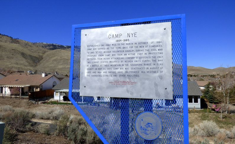 Camp Nye (1862-1865) - A U.S. Civil War Camp first established in 1862 near Carson City, Nevada. Named Camp Nye after James W. Nye, Governor of Nevada (1861-1864). Abandoned in 1865. HistoryEstablished in June 1862 by California Volunteers and later garrisoned by companies "D" and "E", 1st Battalion Nevada Volunteer Cavalry in October 1864. Abandoned 10 Sep 1865 with the muster out of the Nevada volunteers (last post return). Current StatusMarker only near Carson City, Nevada.