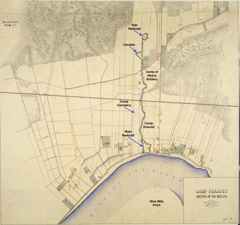 HistoryIn the summer of 1861, Confederate forces made plans to defend the approaches to New Orleans from the north with a line of breastworks, to be fortified with up to 50 pieces of heavy ordnance. By late summer, fortifications were already erected from the Mississippi River north toward the swamp. These fortifications were described as being an extended parapet nine feet high fronted by a 30-foot-wide moat six feet deep. The line of breastworks had not been completed when Commodore Farragut's Union fleet broke through the two forts guarding the southern route to New Orleans and appeared before the city on 25 Apr 1862. Fleeing Confederate forces abandoned the unfinished defenses leaving behind the heavy artillery already emplaced. Fort John M. MorganConfederate Fort John M. Morgan was on the east bank of the Mississippi river bank at the southern terminus of the breastworks which stretched northward about 1.5 miles. The fort was officially named "Fort John Morgan" by New Orleans commander Major General Mansfield Lovell on 21 Mar 1862, just a month before Union forces arrived. The arriving Union forces found nine 42-pounders and two 32-pounders inside the fort, along with the remainder of the line, were nine 24-pounder carronades and four 18-pounders. All but nine of the cannons had been spiked by the retreating Confederates and all the carriages had been at least partially burned by them. There was some indication that the garrison had been removed to the south side of the city when it became apparent that Farragut's attack was coming from the south up the Mississippi. The magazine at the fort was found empty. A hotshot furnace was undisturbed at the site and about 1000 rounds of 32-pounder shot were found. Confederate gunners from the fort had carried away their remaining stores and left via the Jackson Railroad, minus their heavy artillery. The unnamed gun battery supporting the Fort Morgan on the other side of the Mississippi River was found in similar condition. That battery was replaced with the Union Fort Banks. Camp ParapetA November 1863 Union map of what the Union forces had come to describe as Camp Parapet included the completed breastworks with three fortifications along its length and several campgrounds behind the fortifications. The Union forces had upgraded the original Confederate defenses to protect against any attempt by the Rebels to retake New Orleans by coming down the Mississippi River. The Union Camp Parapet averaged some 3,500 troops at any one time during its operation.