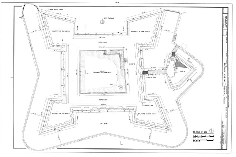Castillo de San Marcos (1672-1900) - A Spanish coastal fort established in 1672 at St. Augustine, St. Johns County, Florida. Abandoned in 1900. Also known as Fort Marion. The Castillo de San Marcos is a masonry star fort built up over a number of years to have four named full bastions, San Pedro, San Agustín, San Carlos, San Pablo and a significant ravelin protecting the sally port. The 35' high walls were surrounded by a wet moat and earthworks. The walls were constructed of coquina stone, a local stone made of shells that is similar to limestone. The stone was quarried on Anastasia Island and shipped to the fort by boat. This stone has a significant quality in that it could absorb shell fire without significant damage. The central court was a two-story quadrangle with four almost equal sides of about 110' with casemates on the lower level. The upper-level gun decks were supported by arches.