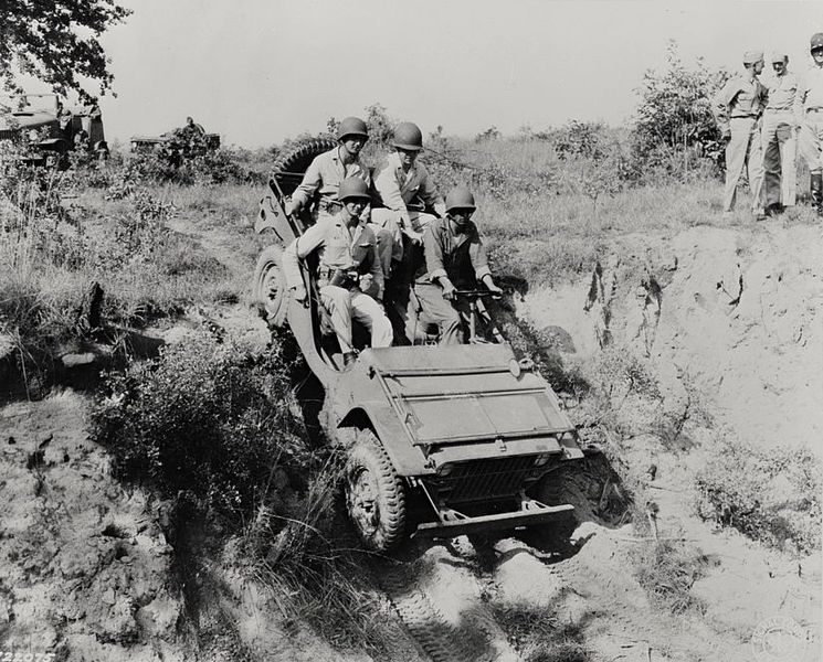 Fort Benning World War II, West Point cadets in a Jeep, public domain This image is available from the United States Library of Congress, Prints and Photographs Division under the digital ID 8e01242v. No known copyright restrictions.