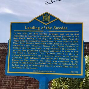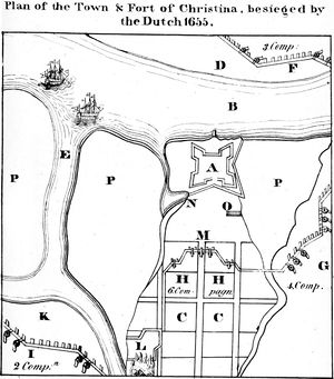 History of Fort Christina(A) Fort Christina; (B) Christina Creek; (C) town of Christina Hamn; (D) Tennekong Land; (E) Fiske Kil (now Brandywine Creek); (F) Snake Battery, of four guns; (G) Gnat Battery, of six guns; (H) Rat Battery, of five guns; (I) Fly Battery, of four guns; (K) Timmer Öland (Timber Island); (L) kitchen; (M) position of the besiegers; (N) harbor; (O) mine; (P) reed flats; and ‘Comp’= Companies of Dutch soldiers. The site of the first permanent Swedish settlement in 1638. The colony became known as New Sweden and the fort erected was known as Fort Christina. The Swedish expedition was headed by the Dutchman Peter Minuit, who had been hired by the New Sweden Company to guide the expedition from Sweden in December 1637. The expedition consisted of 50 men, in two vessels (the Kalmar Nyckel and the Fogel Grip), that landed at a natural pier of rocks that jutted into the Christina River at its confluence with the South River. In 1651, the Dutch under Peter Stuyvesant established Fort Casimir at present-day New Castle, only 7 miles south of Fort Christina. In 1654, the Swedes captured the Dutch Fort Casimir under the orders of Governor Johan Risingh. The capture of Fort Casimir inflamed the Dutch, who then prepared to completely drive out the Swedes. In 1655, the Dutch under Peter Stuyvesant recaptured Fort Casimir and laid siege to Fort Christina. The fort surrendered 16 days later without bloodshed. The Swedish colonial presence was ended and the fort was renamed Fort Altena by the Dutch. (details of the action and surrender are given in Carson, "Dutch and Swedish Settlements on the Delaware", PaMHB:13‑15). The fort remained under New Netherlands until the English took over in 1664. Under English rule, the fort fell into disrepair and had all but disappeared by the end of the 1680s.