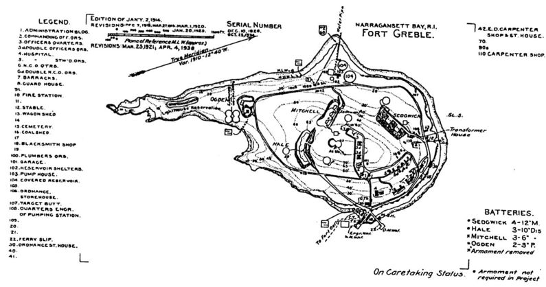 Fort Greble (2) (1898-1946) - An Endicott Period Coastal Fort first established in 1898. Named in G.O. 59, 1898, after 1st Lieutenant and Bvt. Lieutenant Colonel John Trout Greble, 2nd U.S. Artillery, the first United States Military Academy graduate killed in the U.S. Civil War and perhaps the first Union officer killed in that war. He was killed at the Battle of Big Bethel 10 Jun 1861. Post abandoned in 1946. Endicott PeriodPart of the Harbor Defense of Narragansett Bay. Construction of the four Endicott Period gun batteries began in 1897 and was complete by 1904 at a total cost of $ 334,809. Initial post construction continued between 1898 and 1904. Officers row initially contained six sets of quarters, the commanders quarters, three single captains quarters and two duplex lieutenants quarters. Two 109 man barracks and several sets of NCO quarters housed the enlisted men. A 12 bed hospital and hospital stewards quarters were built along the road from the wharf. By 1910 the small post was essentially complete.