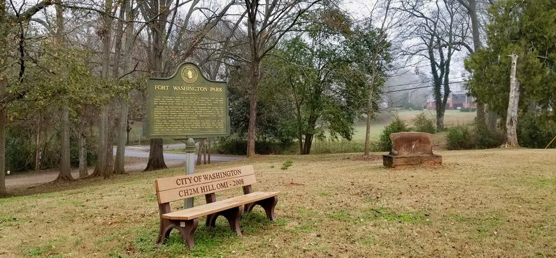 As the Revolutionary War escalated, Tories and Indians harassed the small colony. On one occasion, while Heard was absent, his young wife was driven out into a snowstorm by Tories with her small baby and both perished. Other members of this family were imprisoned by the British in Augusta but were rescued during the siege of Agusta. On 14 Feb 1779, Heard took part in the Battle of Kettle Creek in Wilkes County. Patriot forces ambushed a regiment of almost 600 Loyalist Tories. The Loyalist forces were defeated with only 270 surviving the ambush. Heard distinguished himself in the Battle of Kettle Creek, was wounded, captured and taken as a prisoner to Fort Cornwallis in then British-held Augusta to be hung for treason. He was reportedly rescued by his female slave Mammy Kate. Kate convinced the British to let her bring Heard food and fresh clothing. On her departure, she hid Heard in a large laundry basket and carried him out of the prison on her head. (Heard is described as a small but handsome man) Stephen Heard gave Kate her freedom and a small tract of land with a comfortable four-room house where she lived until she died. Kate and her husband are buried in the same family cemetery as Stephen Heard. Current StatusFort #1 was initially known as Fort Heard, was renamed Fort Washington when the town became Washington and was probably abandoned as a fortification sometime after the war. The site subsequently became the home of General B.W. Heard and is now a portion of courthouse square known as Fort Washington Park. There is a marker for Fort Washington (8) in back of the courthouse.