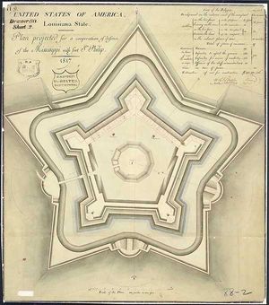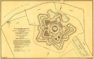 Fort Jackson (2) (1832-1922) - A Third System Coastal Fort first established in 1832 on the Mississippi River at Plaquemines Bend, Plaquemines Parish, Louisiana. Named after General Andrew Jackson, seventh President of the United States. Abandoned in 1922. Third System (1816-1867)Part of the Harbor Defense of the Mississippi. Defended Plaquemines Bend on the Mississippi River.