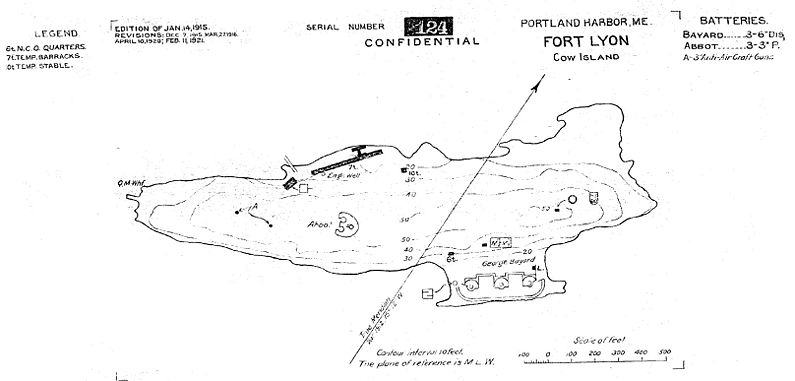 Fort Lyon (1) (1896-1946) - An Endicott Period Coastal Fort first established in 1896, as a sub post of Fort McKinley, on Cow Island, Cumberland County, Maine. Named Fort Lyon in G.O. 194, 27 Dec 1904, after Brigadier General Nathaniel Lyon, U.S. Volunteers (Captain 2nd U.S. Infantry), who served during the Mexican-American War and the U.S. Civil War, and who was killed in action at the Battle of Wilson's Creek, Missouri, 10 Aug 1861. Turned over to the city of Portland, Maine, in 1946. Assigned Location ID ME00093. Endicott Period (1890-1910)Part of the Harbor Defense of Portland, Maine. Fort Lyon was built on 22 acres of Cow Island, Cumberland County, Maine. The whole island was acquired by the government in 1873. Two Endicott Period gun batteries were built on Fort Lyon, Battery Bayard was accepted for service on 27 Dec 1907 and Battery Abbot was accepted for service on 29 Jan 1909. A Double M" Station (29 Jan 1909) and a Searchlight Observing Station (6 May 1911) were also located on the island. Fort Lyon operated as a sub-post of Fort McKinley, and much of the time was in caretaker status. A single set of NCO quarters was constructed on the island in 1907 to house an ordnance sergeant caretaker. Freshwater was furnished to the post via an underwater pipe from Fort McKinley except during the winter when it was turned off. A small well was used during the winter. A latrine and lavatory was constructed at the rear of Battery Bayard and accepted for service 11 Aug 1908 at a cost of $1,072.82.