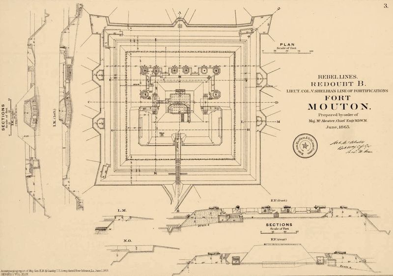 Fort Mouton (1863-1865) - A Confederate U.S. Civil War Fort established in 1863 in Mobile, Mobile County, Alabama. Named Fort Mouton after Confederate General Alfred Mouton(Cullum 1487), who was killed in combat at Mansfield, Louisiana on 8 Apr 1864. Abandoned at the end of the war in 1865.