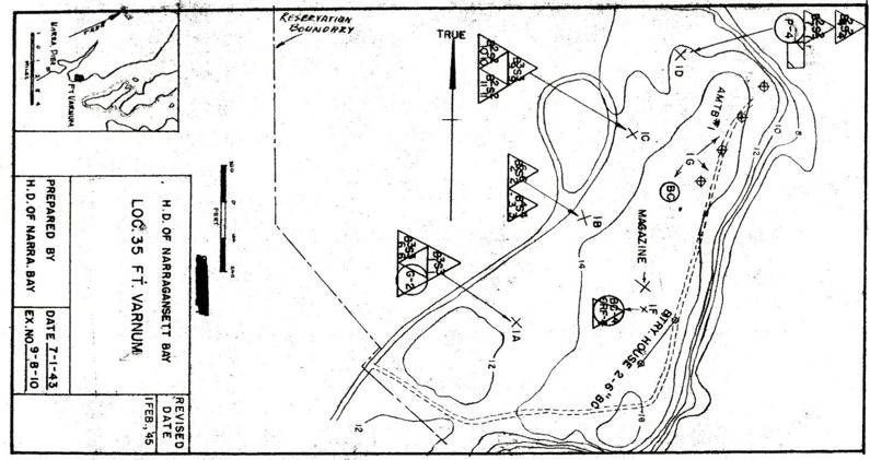 Fort Varnum (1941-1948) - An World War II Coastal Fort first established in 1941 at Boston Neck, Washington County, Rhode Island. Named in G.O. 61, 6 Nov 1942, after Brigadier General James Mitchell Varnum, Continental Army. Abandoned in 1948. World War IIPart of the Harbor Defense of Narragansett Bay. Fort Varnum had thee gun batteries emplaced, two of them were transferred from other coastal forts and the third was a battery of four 90mm AMTB guns. Also on the post were a number of fire control batteries disguised as houses and a mine command post.