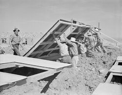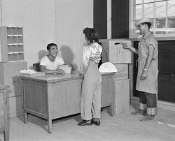 Residential AreasFacilities at the center included 30 residential blocks with each block having twelve, 20' by 120' barracks structures and five service buildings. The service buildings included a 40' by 100' mess hall, a 20' by 50' laundry, two latrines and an ironing room. These buildings were all temporary military-style Theater of Operations (TO) structures of wood frame construction but had fibreboard or asbestos shingle siding, rather than the tarpaper common at most of the other relocation centers. The foundations of the barracks were a slab or concrete perimeter construction with brick floors rather than the post-and-pier foundations of other centers.