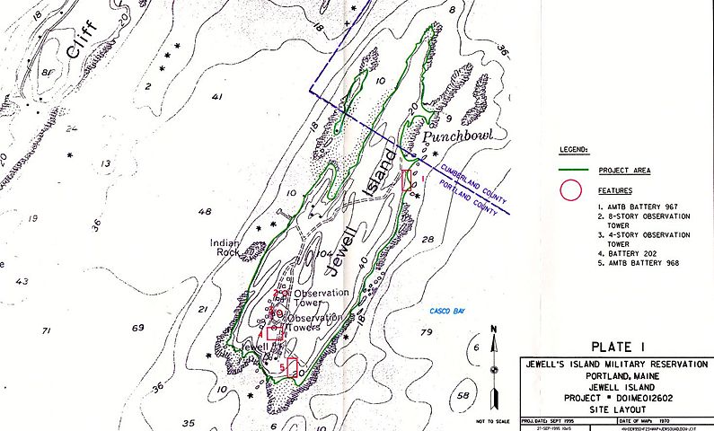 Jewell Island Military Reservation (1922-1946) - A World War II Coastal Military Reservation first established in 1922 on Jewell Island in Cumberland County, Maine. Named in War Department G.O. 8, 1937. Abandoned in 1946. Assigned Location ID ME00064. World War IIPart of the Harbor Defense of Portland, Maine. A small 3.71-acre site was purchased in 1922 as the first parcel of land on the Jewell Island Military Reservation. The reservation was not named until 1937. In 1942 an additional 56 acres was purchased. The remainder of the Island, 166 acres, was purchased in 1943. Facilities constructed on the reservation included Battery 202 and BC Station, Battery AMTB 967, Battery AMTB 968, a large concrete fire control station and an SCR-296 fire control radar set. The 90mm AMTB batteries had a primary defense mission against enemy motor torpedo boats and a secondary defense mission against aircraft attack. Battery AMTB 968 was positioned on the north end of the island and Battery AMTB 967 was positioned on the south end of the island. Each AMTB battery usually included the two fixed-mount 90mm guns, two mobile mounted 90mm guns, and two or more 37mm. This configuration was variable and, depending on the threat level, the mobile guns may have been in storage.