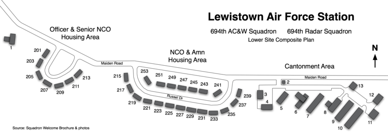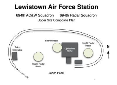 ClosureLewistown AFS was officially Inactivated on 1 Jul 1971 as recorded by SO GA-29, DAF, Wash DC, 31 Aug 1971, para 2. Physical PlantThe physical plant of the site was divided into an upper radar/operations site on Judith Peak, a separate GATR radio site on Red Mountain, and a lower site with the cantonment area and two housing areas. A modern grade school built by USAF, operated by the Lewiston School District and staffed by three teachers was built just up the road from the lower site. This school served the Air Force dependents and local children as well. Dependent high school students were transported to Lewiston high schools. The upper radar/operations site housed the operations building, communications center, the radar towers, and the backup generators. The lower cantonment area housed the support functions including the enlisted barracks, the bachelor officer's quarters, the orderly room, the mailroom the dining hall, the motor pool, and other support activities. The dining hall seated 65 personnel providing four meals a day, breakfast, lunch, dinner, and a midnight meal for shift workers. A hot noon meal was prepared in the dining hall and transported to the upper site for topside shift workers. Apart from the cantonment area were two housing areas. A seven-unit housing area was provided for officers and senior NCOs. A separate twenty unit housing area was provided for lower-ranking NCOs and airmen. A separate upper GATR radio site was built on Red Mountain in 1960 to house the radio equipment for directing aircraft intercepts. The contract cost of the GATR Site was $256,166 for a 26 by 113-foot masonry block building and 1.5 miles of an access road. The GATR site was about three miles from the main upper site.