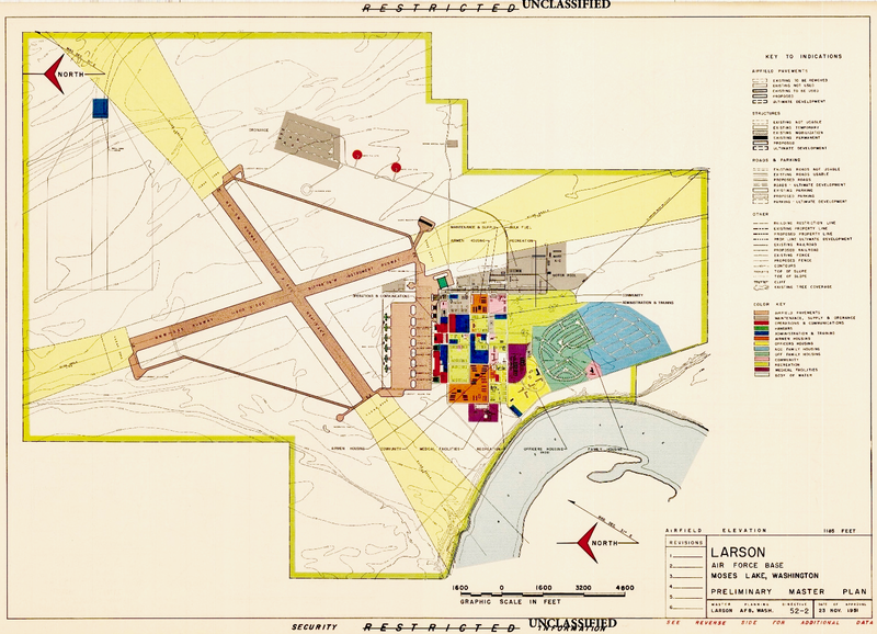World War IIMoses Lake Army Air Base was activated on 24 Nov 1942 as a temporary World War II aircrew training center. Initially, it trained pilots for P-38s and later combat crews for B-17 Flying Fortresses. The base was established just north of the tri-cities of Pasco, Kennewick, and Richland, where the secret Hanford atomic bomb development took place, and close to the Bonneville and Grand Coulee hydroelectric dams on the Columbia River. The Bonneville dam opened in 1937 and the Grand Coulee dam opened in 1942 both became critical to the war effort, providing power not only for the Atomic bomb development but for aluminum production, and numerous defense plants and it provided water for crops irrigation. Post World War IIAt the end of the war in 1945, the military portion of the base was put on standby status, and Boeing Aircraft Company facilities associated with the base were used in the development and testing of the B-47 and the B-50 bombers. In 1947 the Air Force became a separate service and the Moses Lake Air Force Base was reactivated in November 1948 under the Air Defense Command. The mission of F-82, F-94, and F-86 fighters was to protect the vital Hanford Atomic Works, Bonneville & Grand Coulee Dams, and the coastal area. On 1 Apr 1952, Larson AFB was placed under the Tactical Air Command and the 62d Troop Carrier Wing moved from McChord AFB, Washington to assume command. During the next eight years, the 62d was prominent in national news events with missions in DEW Line and communications network construction, mercy flights, and flights to Formosa and Africa. Larson became a Military Air Transport Service (MATS) base on 1 Jul 1957 and in June 1958 Larson was put under the newly created Western Transport Air Force of MATS. The Air Materiel Command (AMC) Flight Test Center at Larson tested B-52s at the field from February 1955 to 1959. Boeing built a $5.8 million hangar to accommodate eight B-52s or KC-135 tankers. The hangar was 1,068 feet long and 372 feet wide, with clear spans of 217 feet. The Strategic Air Command (SAC) assumed command of Larson AFB on 1 Jan 1960 and established the 462d Strategic Aerospace Wing as a part of its Fifteenth Air Force. The 568th Strategic Missile Squadron was officially activated on 1 April 1961 as a 4170th Strategic Wing unit. There were three Titan I missile complexes with three missile silos at each complex. The nine Titan I silos were evenly split between three sites near Odessa, Warden, and Othello, Washington. Support facilities were located at Larson AFB. The contractor(s) broke ground on 1 Dec 1959. The missile complexes were officially deactivated on 25 Mar 1965 and the missile sites were turned over to the General Services Administration (GSA) for disposal.