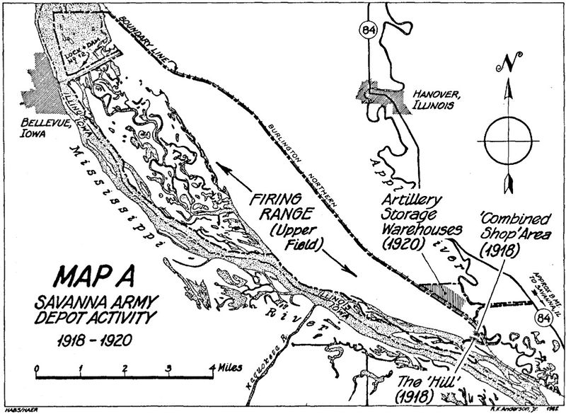 Savanna Army Depot (1918-2000) - A U.S. Army Depot first established as Savanna Proving Ground in 1918 during World War I near Savanna, Jo Daviess County, Illinois. Abandoned in 2000. Other official names over the years include Savanna Army Depot Activity, Savanna Army Depot and Savanna Ordnance Depot. Savanna Proving Ground (1918-1921)Text and Maps below adapted from LOC - HAER IL-19, Data Pages, Savanna Army Depot, Savanna, Carroll County, IL The Sundry Civil Act passed by Congress on 12 Jun 1917 appropriated 1.5 million dollars for the establishment of a proof-firing facility for the testing of artillery and ammunition. The Commanding Officer at Rock Island Arsenal, Colonel George W. Burr, (Cullum 3241), was authorized to purchase the land and make the necessary improvements for this facility to operate under the Rock Island Arsenal. Construction began for the proving ground in April 1918 during World War I on the selected site near Savanna, Illinois. The proving ground officially opened on 26 Dec 1918 shortly after World War I had ended. Proof-firing activity had already begun in September 1918. The "Hill" area and the "Combined Shop" area were developed on a small area at the southeast extreme of the depot. Buildings on the "Hill" included the commanding officer's residence, officers' quarters, men's barracks, administration building, hospital, and Boulenge Instrument building. The "Combined Shop" area included an ammunition storage house, instrument house, garages, vehicle storage warehouse, engine house, and several firing points.
