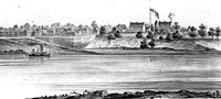 Major Long and a party of seven men preceded the main force, selected the site and staked out the fort. The post was established 25 Dec 1817 by Major Bradford and 57 men from Company A, 3rd U.S. Rifle Regiment, as a simple 132' square log and stone stockade with two blockhouses on opposing corners. Four women were also in the main force. The new post was also known as Belle Point Fort and some of the the foundations can be seen today. The garrison was small and never held more than about 130 men. The new post was not completed until 1822.