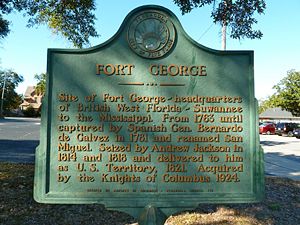 Fort George (9) (1779-1814) - A British colonial fort established in 1772 by British General John Campbell in present day Pensacola, Escambia County, Florida. Besieged and taken in 1781 by the Spanish under Bernardo de Galvez. Renamed Fort San Miguel and rebuilt by the Spanish in 1783. Fell into ruin after being bombarded by General Andrew Jackson in 1814 during the War of 1812. Abandoned in 1814. Also known as Fort St. Michael.