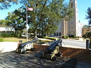 Part of Fort George City Park in Pensacola, Escambia County, Florida. A partial reconstruction displays a short section of wall with two cannons mounted above.