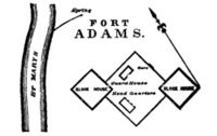 Fort Adams was a small fort built in a star shape with two 18 foot square blockhouses at opposite corners. Only two buildings were built, the commandants quarters and a guardhouse.