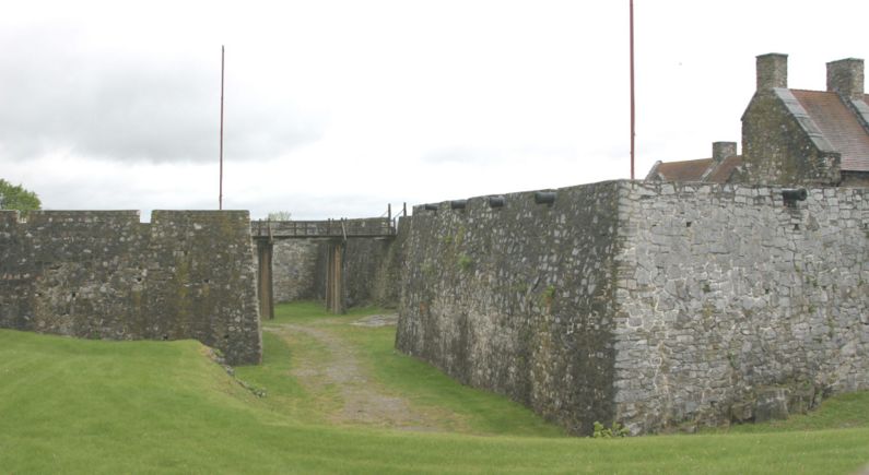 The walls were seven feet high and fourteen feet thick. The wooden exterior walls were dressed with stone from a local quarry. The structures inside the fort were constructed of stone and most were higher than the seven foot walls. The fort was surrounded by a glacis and a dry moat five feet deep and fifteen feet wide. The fort was essentially complete by 1758 and armed with cannons from Montreal and Fort St. Frederic.