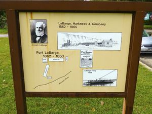 Fort La Barge (1862-1863) - A fortified fur trading post established in 1862 during the U.S. Civil War by Joseph La Barge and James Harkness of the La Barge, Harkness & Company of St. Louis in the present day town of Fort Benton Chouteau County, Montana. Abandoned in 1863 and sold to the American Fur Company. Also spelled Fort LaBarge. Fort La Barge HistoryJoseph La Barge and his partner James Harkness arrived at Fort Benton on 17 Jun 1862 aboard their "Emilie", the first side wheeler steamboat to reach Fort Benton. La Barge and Harkness established Fort La Barge as a 300' by 200' fortified trading post on the bank of the Missouri River. La Barge's wife drove the first stake and his daughter the second stake outlining the fort. The post was laid out in a "U" shape with the open end facing the river. The post was abandoned in 1863 because of difficulties with the Blackfeet Indians and was sold to the American Fur Company at nearby Fort Benton. Current StatusA two sided marker located in the park at 10th and River Streets in the town of Fort Benton, Chouteau County, Montana. The actual site may be further south of the marker location. USGS Geographic Names Information System (GNIS) Database Entry: 1750083