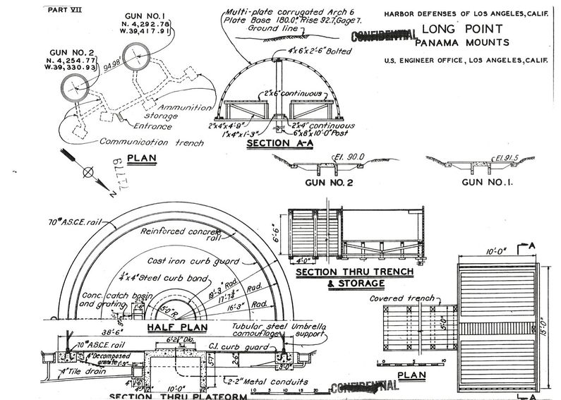 In the opening days of World War II in December 1941, Battery B of the 3rd U.S. Coast Artillery moved two 155mm GPF M1918 guns from the upper reservation gun park at Fort MacArthur to emplacements at Long Point Military Reservation. These guns were placed in temporary field emplacements right on Long Point and were later replaced by two Panama mounts. The Panama mounts were completed by the end of March 1942 and the guns were emplaced there until Battery 240 was completed and proof fired in November 1943. The emplacements were located on the north side of Long Point below the 1930s fire control stations and Battery 240. Troop barracks were located beteen the road and the gun battery.