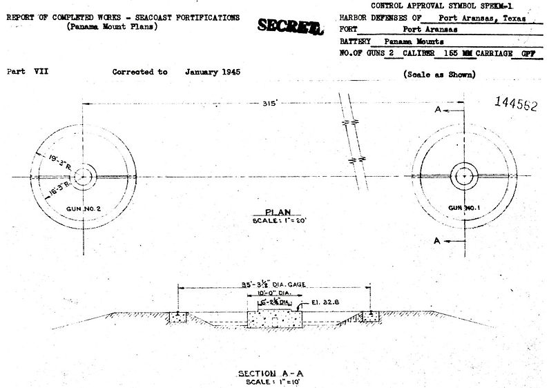 Battery 155 - Port Aransas (1942-1944) - Battery 155 - Port Aransas was a temporary, World War II, 155mm coastal gun battery on Panama mounts. Located on Port Aransas Military Reservation, Nueces County, Texas. Battery construction started 26 Nov 1942, was completed 13 Dec 1942 and transferred to the Coast Artillery for use 11 Nov 1943 at a cost of $ 24,726.42. Deactivated in 1944. World War IIPart of the Temporary Harbor Defense of Aransas Pass, Texas. Originally built as a temporary World War II coastal gun battery with two 155mm M1918 rapid fire guns mounted on M1917 Mobile Carriages emplaced on circular Panama mounts. The 155mm guns replaced a temporary 105mm howitzer field artillery battery on 11 Apr 1942. The two Panama mounts were placed on mounds that were stabilized with gunite. The mounds raised the gun trunion elevation to 37' 6". Both of the Panama mounts were of the 360 degree variety. Ramps were provided to allow positioning of the guns on the Panama mounts. Five splinter proof magazines were provided along with a 23' by 17' plotting room. The Temporary Harbor Defense of Aransas Pass was deactivated on 1 Jul 1944 and on 3 Jul 1944 the guns were removed. The troops departed on 4 Jul 1944.