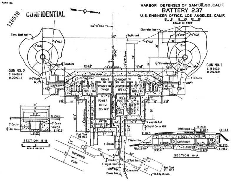 Battery 237 (1943-1946) - A World War II era Battery built in 1943 as a reinforced concrete coastal artillery battery on Fort Rosecrans, San Diego County, California. Later named Battery Woodward for Colonel Charles G. Woodward, who had commanded Fort Rosecrans as a captain in 1906-1907. Construction began 4 Mar 1943 and was completed 29 Oct 1943. The Battery was turned over for service 31 Aug 1944 at a cost of $ 255,912.24. Deactivated in 1946.