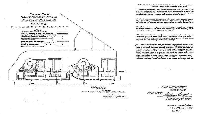 Battery Berry (1901-1943) - Battery Berry was a reinforced concrete, Endicott Period 12 inch coastal gun battery on Fort McKinley, Great Diamond Island, Cumberland County, Maine. The battery was named in G.O. 43, 4 Apr 1900, after Major General Hiram G. Berry, U.S. Volunteers, a native of Maine, who was killed in action at Chancellorsville, Virginia, 2 May 1863, during the U.S. Civil War. Battery construction started in 1897, was completed in 1900 and transferred to the Coast Artillery for use 16 Apr 1901 at a cost of $ 111,056.92. Deactivated in 1943.
