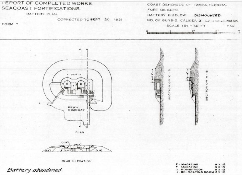 Battery Bigelow (1904-1920) - Battery Bigelow was a reinforced concrete, Endicott Period 3 inch coastal gun battery on Fort De Soto, Florida. The battery was named in G.O. 78, 15 May 1903, after 1st Lt. Aaron Bigelow of the 21st U.S. Infantry, who was killed 25 Jul 1814 at the battle of Lundy's Lane, Ontario, Canada, during the War of 1812. Battery construction was completed in 1902 and transferred to the Coast Artillery for use 28 Jun 1904 at a cost of $ 13,980.18. Deactivated in 1920.