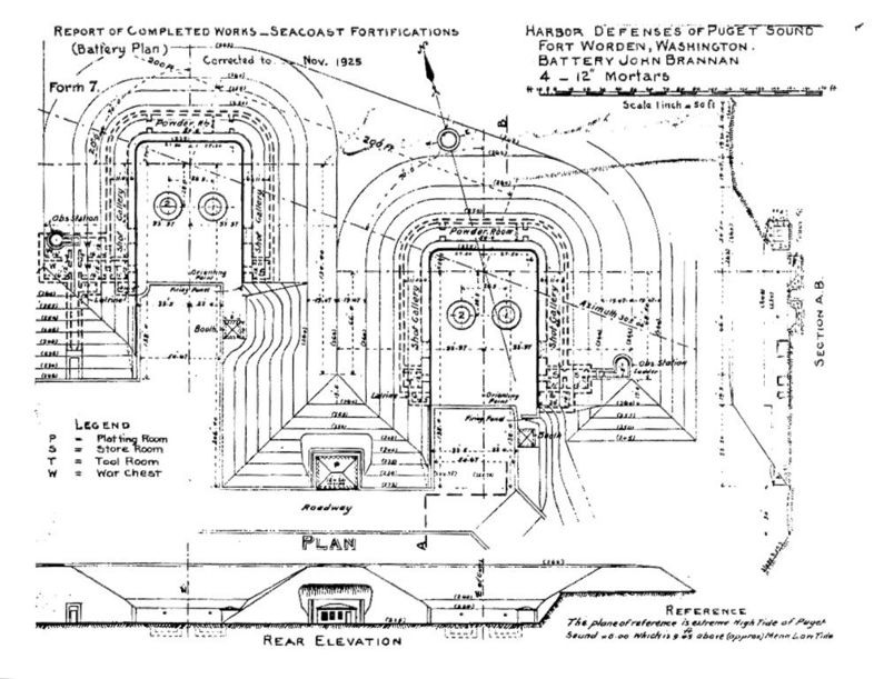 Endicott Period (1890-1910)Part of the Harbor Defense of Puget Sound. Designed to protect both the Straight of Juan De Fuca and the Admiralty Inlet to Puget Sound. This Battery and Battery Powell (1) originally was built as one large mortar battery housing sixteen 12" M1890MI mortars on M1896MI carriages in a concrete battery with four mortar pits (A-D). The original battery was split into two batteries in 1908, mortar pits A and B became Battery Brannan and pits C and D became Battery Powell (1). Each of the mortars was capable of firing a seven hundred pound shell nine miles and proved accurate enough to hit a moving practice target seven miles away in 1913.