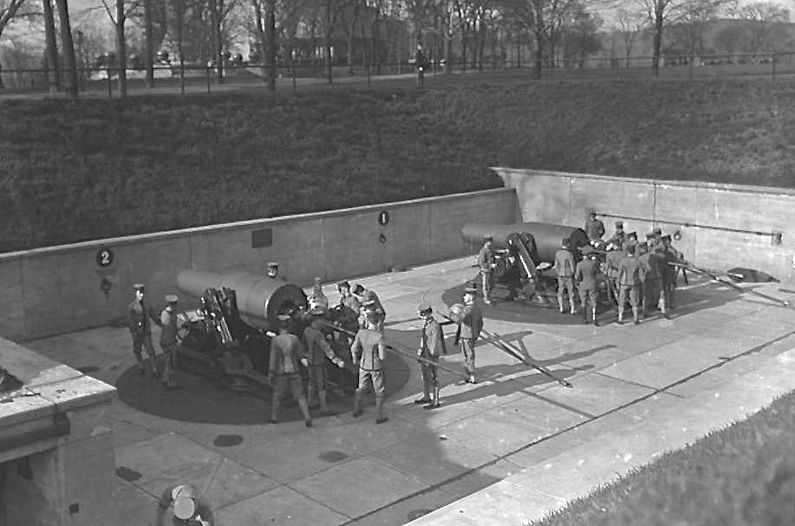 Battery Byrne - West Point (1911-1931) - Battery Byrne - West Point was a reinforced concrete, Endicott Period 12 inch coastal mortar battery at West Point, Orange County, New York. The battery was named after West Point Cadet Eugene A. Byrne who died 30 Oct 1909 from injuries sustained in a West Point vs Harvard football game. Battery construction started and was completed and transferred to the United States Military Academy in 1911 with an appropriated cost of $6,800. Deactivated in 1931. Endicott PeriodOriginally built as an Endicott Period concrete coastal mortar battery with two 12" M1890MI mortars mounted on M1896MI mortar carriages in one one mortar pit. This battery was built to provide a training platform for USMA cadets and was somewhat a skeleton of a real mortar battery. All the components of a full sized mortar pit were provided including a gallery for ammunition service and two magazines, one on each side. The difference from a war ready mortar battery is one of scale, the magazines are the correct width but only 16' long, the roof and walls were reduced to withstand only earth pressure not exploding shells. The gun platform thickness was reduced to support the reduced pressures of sub-caliber firing. The earthworks surrounding the battery were also reduced to the level of the surrounding plain. With the drastic reduction in requirements for Coast Artillery officers the 1930s the battery was abandoned as an instructional platform. An attempt was made to disassemble the battery but it was decided to bury it in place, mortars and carriages included. Recent attempts using ground penetrating radar to confirm that the mortars and carriages are still there were inconclusive. They may have been salvaged during the quota driven scrap drives of World War II.
