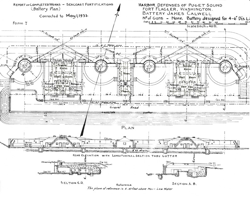 Battery Calwell (1907-1917) - Battery James Calwell is a reinforced concrete Endicott Period 6 inch gun battery on Fort Flagler, Washington. Named in G.O. 194, 27 Dec 1904, after Capt. James H. Calwell, Virginia Volunteers, who died in in the Mexican-American War, on 18 Sep 1847. Battery construction started in 1903 was completed in 1905 and transferred to the Coast Artillery for use on 23 Apr 1907 at a cost of $ 89,500. Deactivated in 1917.