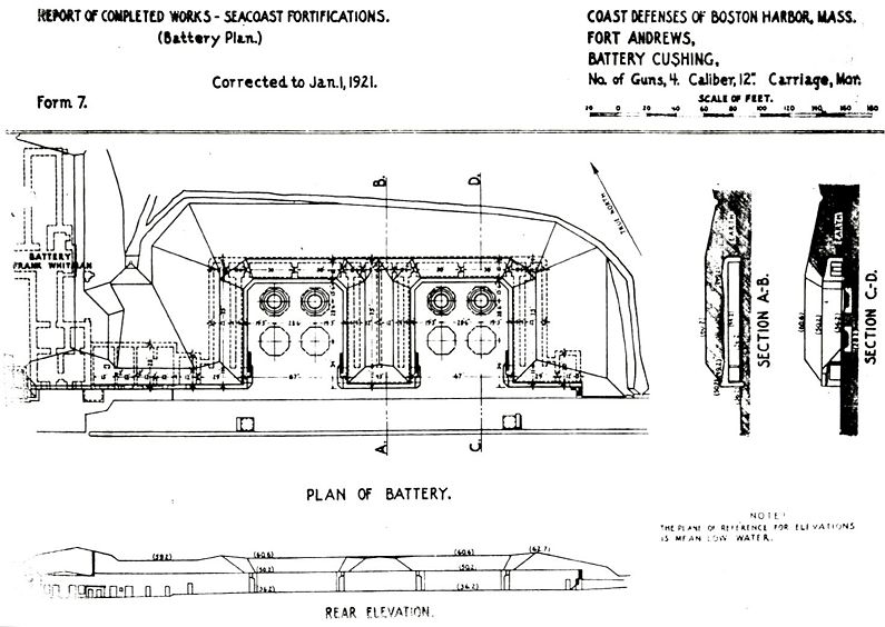Battery Cushing (1904-1942) - Battery Cushing was a reinforced concrete, Endicott Period 12 inch coastal mortar battery on Fort Andrews (1), Plymouth County, Massachusetts. The battery was named in G.O. 78, 25 May 1903 after Brigadier General Thomas H. Cushing, U.S. Army, who served in the Revolutionary War and the War of 1812 and who died 19 Oct 1822, at New London, Connecticut. Battery construction started in 1901, was completed in 1904 and transferred to the Coast Artillery for use 29 Dec 1904 at a cost of $ 150,576.31. Deactivated in 1942.