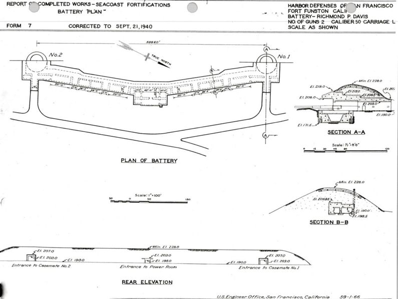 Battery Davis (2) (1940-1948) - Battery Richmond P. Davis was a reinforced concrete, World War II 16 inch casemated coastal gun battery on Fort Funston, San Francisco County, California. The battery was named after Major General Richmond P. Davis. Battery construction started in November 1936, was completed 1 May 1940 and transferred to the Coast Artillery for use 21 Sep 1940 at a cost of $ 670,356.49. Deactivated in 1948.