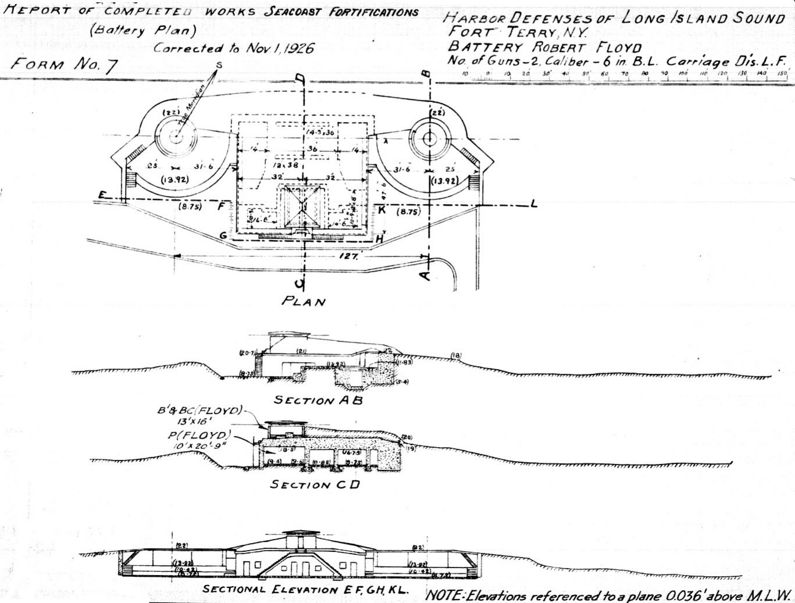 Battery Floyd (1906-1917) - Battery Floyd was a reinforced concrete, Endicott Period 6 inch coastal gun battery on Fort Terry, Plum Island, Suffolk County, New York. The battery was named in G.O. 194, 27 Dec 1904, after 2nd Lt. Robert Floyd, 3rd U.S. Artillery, who died 23 Sep 1863, of wounds received in action at Chickamauga, Georgia, 19 Sep 1863, during the U.S. Civil War. Battery construction started in December 1903, was completed in October 1906 and transferred to the Coast Artillery for use 22 Nov 1906 at a cost of $ 51,626.00. Deactivated in 1917.
