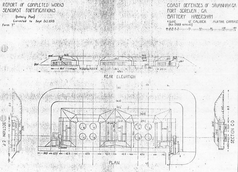Battery Habersham (1900-1942) - Battery Habersham was a reinforced concrete, Endicott Period 12 inch coastal mortar battery on Fort Screven, Chatham County, Georgia. The battery was named in G.O. 43, 4 Apr 1900, after Major Joseph Habersham, Continental Army, who rendered distinguished service during the revolution and later became Postmaster General (1795-1801). Battery construction started in December 1898, was completed in March 1900 and transferred to the Coast Artillery for use 9 Apr 1900 at a cost of $ 125,442. Deactivated in 1942. Endicott PeriodPart of the Harbor Defense of Savannah. Originally built as an Endicott Period concrete coastal mortar battery with eight 12" M1890MI mortars mounted on M1896MI mortar carriages divided into two mortar pits (A-B) with four mortars in each pit (1-4). Each mortar pit had a data booth at the rear that conveyed azimuth and elevation information to the gun crews and directed the firing. The data booth was connected to the plotting room via telephone. Between the mortar pits was a concrete magazine that stored the shells and powder. The magazine was protected with a 20' covering of earth. Shells and powder were wheeled from the magazine to the mortar loading platforms on shot carts.