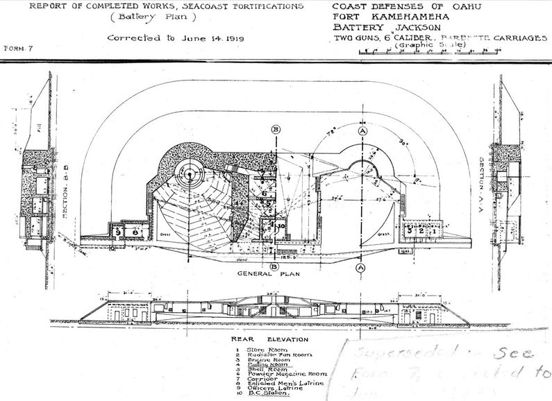 Battery Jackson (1914-1943) - Battery Jackson was a reinforced concrete, Taft Period 6 inch coastal gun battery on Fort Kamehameha, Honolulu County, Hawaii. The battery was named in G.O. 72, 1913, after Brigadier General Henry Jackson, who died 28 Nov 1892. Battery construction started in December 1912, was completed in June 1914 and transferred to the Coast Artillery for use 17 Jun 1914 at a cost of $ 86,067.25. Deactivated in 1943. Taft Period (1905-1915)Part of the Harbor Defense of Pearl Harbor. Originally built as a Taft Period concrete coastal gun battery with two 6" M1908 guns mounted on M1905M2 Disappearing carriages. This was a single story battery with the guns located on the same level as the magazines. Shells were moved from the magazines to the gun loading platform by shell carts. No shell or powder hoists were provided. Electrical power was furnished by the emplacement power plant and the one in Battery Hawkins.