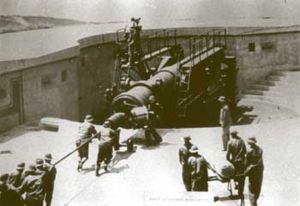 World War II (1941-1945)Battery Leary-Merriam was considered obsolete at the beginning of World War II because of its disappearing carriages and lack of protective casemates. It was kept in operation pending the completion of the modernization program's 16" batteries. Both 14" gun tubes were dismounted early in 1944 and then transferred to the Black Hills Ordnance Depot on 10 Jun 1944. The battery was then converted into a Harbor Defense Command Post (HDCP) and Harbor Entrance Command Post (HECP) and accepted for service on 7 Nov 1944.