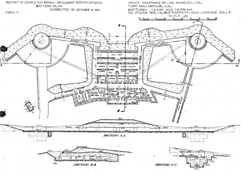 Battery Leary-Merriam (1916-1944) - Battery Leary-Merriam was a reinforced concrete Taft Period 14" gun battery located on Fort MacArthur, Los Angeles County, California. The Battery was constructed as a single two gun battery but each gun emplacement was designated as a separate battery. Gun emplacement #1 was named for Brig. Gen. Peter Leary Jr. and gun emplacement #2 was named for Brig. Gen. Henry Clay Merriam. Battery construction started 20 Jan 1916, was completed 10 Oct 1919 and transferred to the Coast Artillery for use 10 Oct 1919 at a total cost of $251,363. Battery was converted to an HDCP/HECP in 1944.