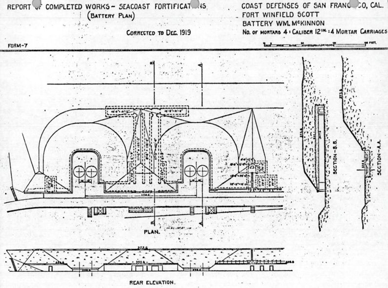 Battery McKinnon (1906-1942) - Battery William McKinnon is a concrete Endicott Period 12" mortar battery located on Fort Winfield Scott (2), San Francisco County, California. Named in G.O. 20, 25 Jan 1906, after Chaplain William D. McKinnon, 3rd U.S. Cavalry, who served with distinction during the Spanish-American War and the insurrection in the Philippine Islands, and who died 25 Sep 1902. Originally built as mortar pits C & D of Battery Stotsenburg in 1898, these two pits were re-designated as Battery McKinnon in 1906. Battery deactivated 1942. Endicott Period (1890-1910)Part of the Harbor Defense of San Francisco. Battery McKinnon was originally mortar pits C & D of Battery Stotsenburg, each of these two pits were built with 4, 12" M1890MI rifled steel mortars on M1896MI mortar carriages in a concrete battery. These two mortar pits were re-designated as Battery McKinnon in 1906. This was a single level mortar battery with the mortar loading platforms on the same level as the magazines. Shells were brought from the magazines by shot carts. No shell or powder hoist were provided or needed. The concrete magazines were built between the mortar pits and covered with some 20' of earth. Electrical power was furnished from a central power plant and a backup emplacement power plant.