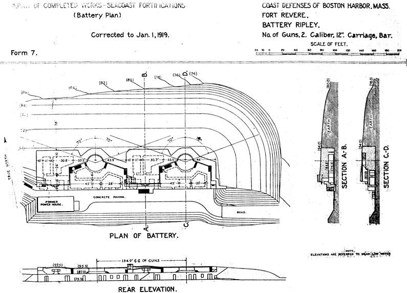 Battery Ripley (1901-1943) - Battery Ripley was a reinforced concrete, Endicott Period 12 inch coastal gun battery on Fort Revere, Plymouth County, Massachusetts. The battery was named in G.O. 78, 25 May 1903, after Major General Eleazer W. Ripley, U.S. Army, who served with distinction in the War of 1812 and who died 2 Mar 1839 at West Feliciana, Louisiana. Battery construction started in 1898, was completed in 1900 and transferred to the Coast Artillery for use 26 Jan 1901 at a cost of $ 110,645.58. Deactivated in 1943.