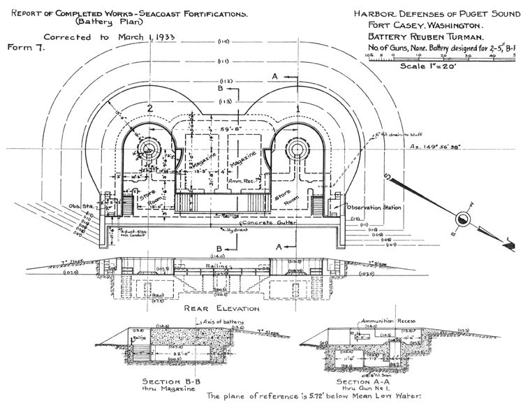 Endicott PeriodPart of the Harbor Defense of Puget Sound. Battery Turman was designed to protect the Straight of Juan De Fuca and the Admiralty Inlet to Puget Sound. Originally built with two, 5" M1897 rifles mounted on M1896 balanced pillar carriages.