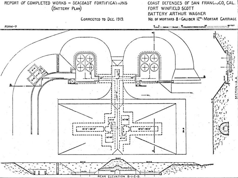 Battery Wagner (1) (1906-1920) - Battery Arthur Wagner is a concrete Endicott Period 12" mortar battery located on Fort Winfield Scott (2), San Francisco County, California. Named in G.O. 20, 25 Jan 1906, after Colonel Arthur L. Wagner (Cullum 2589), an authority on military strategy and a member of the Army General Staff Corps, who died 17 Jun 1905. The Battery was formed in 1906 from the existing mortar pits C and D of Battery Howe. All mortars and carriages were scrapped in 1920.