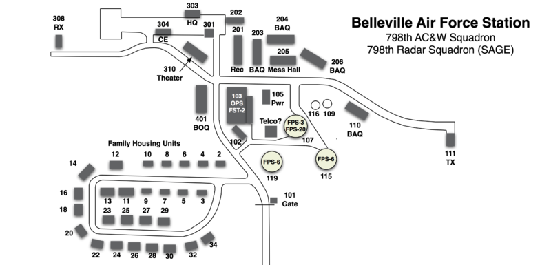 Physical PlantThe physical plant of the site was divided into the main site, a cantonment area, a housing area and three radio sites. The main site housed the operations buildings, the radar towers, and the backup generators. The cantonment area housed the enlisted barracks, the bachelor officer's quarters, the orderly room, the dining hall, the motor pool and other support buildings. Apart from the main site was a small 27 unit housing area (originally just 9 units) for married personnel. A separate radio site housed the radio equipment for directing aircraft intercepts. Like most early radar stations, Belleville originally had a radio transmitter site and a separate radio receiver site used by local controllers for voice direction of fighter interceptors to their targets. With the SAGE System, the SAGE Direction centers had the primary task of directing intercepts and the local radio sites were reconfigured, usually into a single site that was known as the Ground to Air Transmitter Receiver (GATR) site. The GATR site communicated with the interceptors from either the local site or the SAGE direction center via voice commands and/or a digital data link. The Belleville AFS GATR site was located about 3/4 of a mile northeast of the main site.